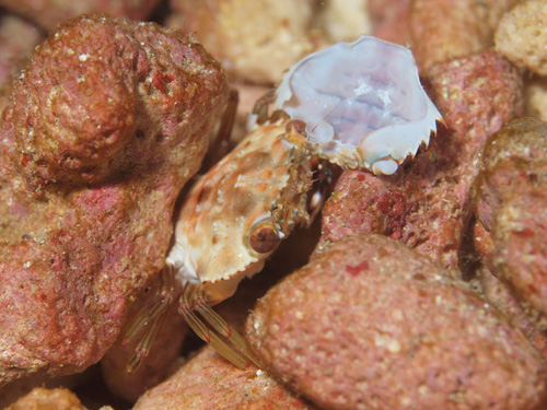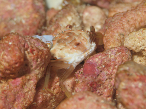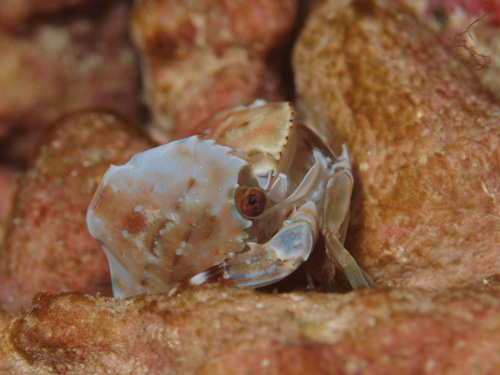 撮影 2014/10/03 沖縄県 石垣島 掲載 ⇒カニの仲間 甲や脚の形からしてワタリガニの仲間に違いないでしょう。 ちょうど脱皮シーンだったのでその様子を連続撮影しました。カメラマンに気づいていたでしょうが、素早く脱皮することが第一優先事項なので、無視されました。計6枚で、左から右、上から下です。