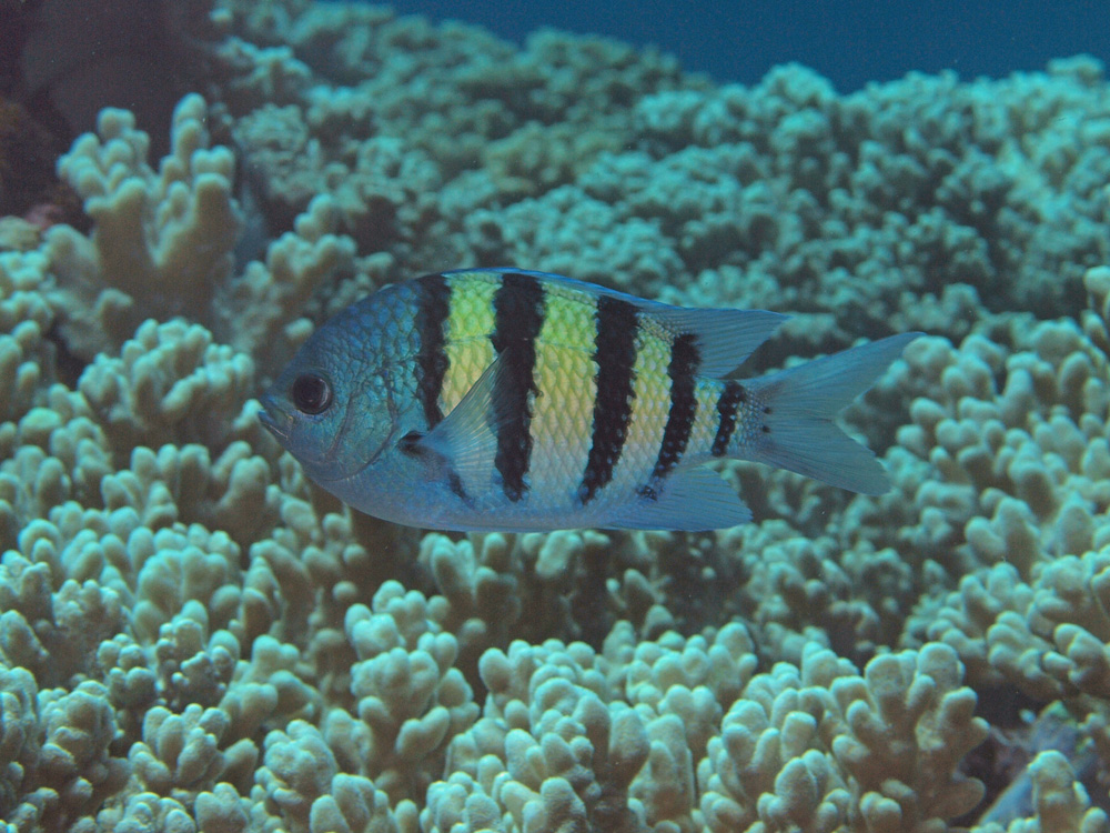撮影 2014/10/03 沖縄県 石垣島 掲載 ⇒スズメダイの仲間 『スズメダイ』 加藤昌一 (2011年初版 誠文堂新光社)によると尾びれ付け根にある2黒点が識別の決め手のようです。なるほど、たしかに他の種はこの2黒点はありません。