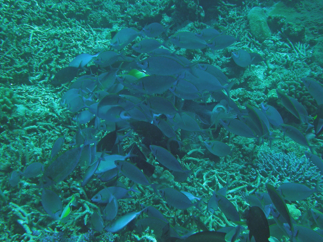 中に色の黒っぽい別種と思われる魚やチョウチョウウオの仲間も紛れ込んでいますが、何でもかんでも全部オッケーという感じで仲良く一緒に移動したり、突然何かを突いたりしていました。