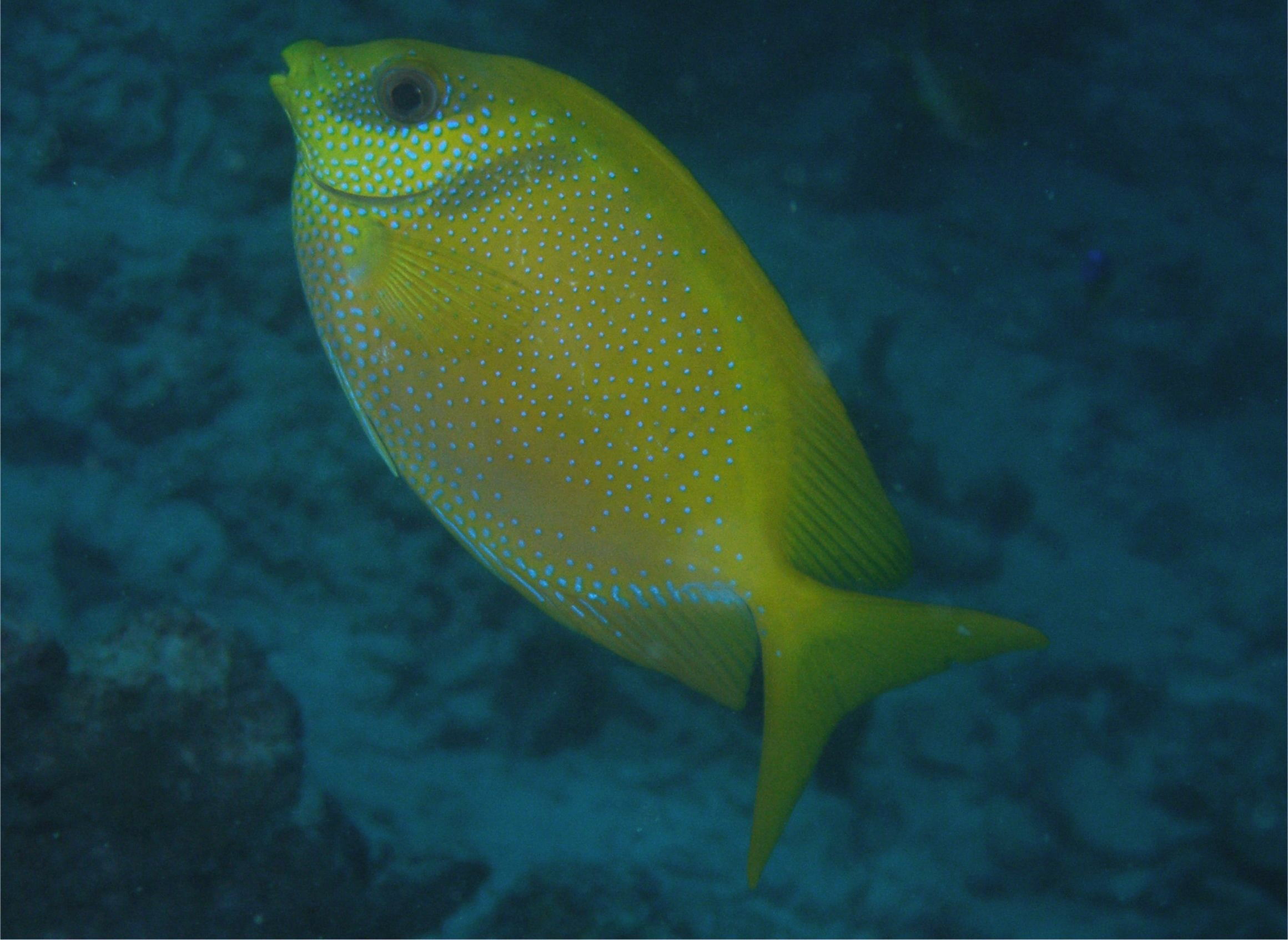 Reef Fishes」で見つけて分かった名前がSiganus tetrazonaでした。念のために「日本産魚類検索」を学名で引いても該当はナシ。日本にはいない魚なんだなー、水玉が綺麗でいかにも南の魚らしいなー、と思ったものでした。