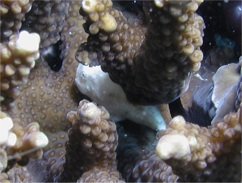 こんな被写体を見つけてくれたガイドに感謝し、いかにもあどけない様子に感激しながら随分時間をかけて何枚もシャッターを押したのですが、枝サンゴの一番奥に隠れているため、この写真がやっとでした。