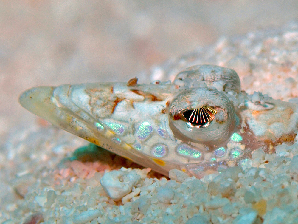 撮影 2009/08/17 沖縄県 竹富島 掲載 2014/07/25 ⇒ベラギンポの仲間 すだれ睫毛がすごいので追加しました。首から下は砂に潜っています。 ほっぺの凸部の銀色もすごい。ギラギラした印象を受けるのはこれが原因ですかね?