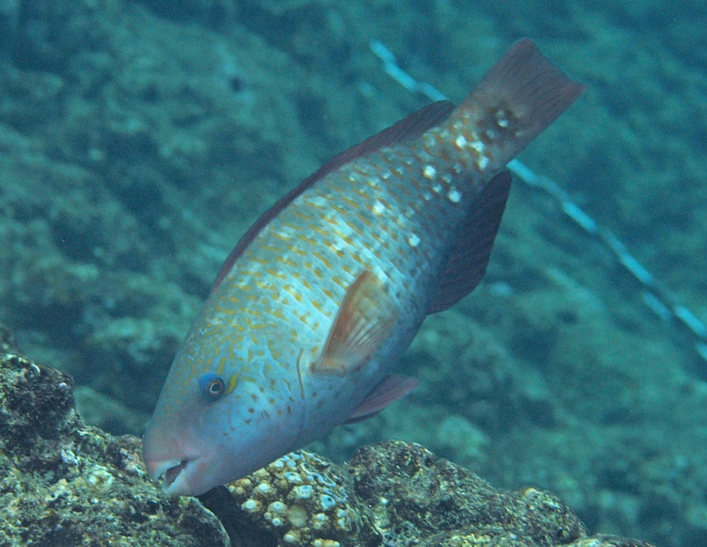 撮影 2013/11/09 沖縄県 沖縄島 掲載 2019/05/11 ⇒ブダイの仲間 今度は雌が撮れたので追加しました。雄も雌も子どもも地味な種類ですが、よく見ると青いアイシャドウを入れています。ウーン、やっぱり女性だなあ。細かいところでキメています。