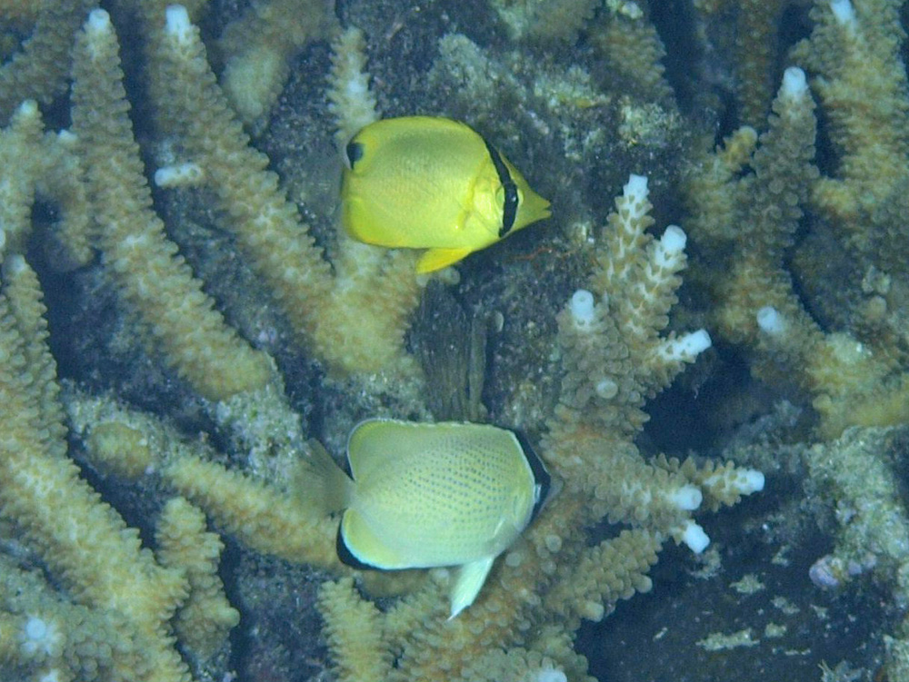 撮影 2009/07/04 沖縄県 西表島 掲載 2014/03/13 ⇒チョウチョウウオの仲間 上の黄色い方がアミチョウチョウウオの幼魚です。 下のゴマチョウチョウウオと仲良しらしくて、2匹で連れ立ってあちこち遊びまわっていました。