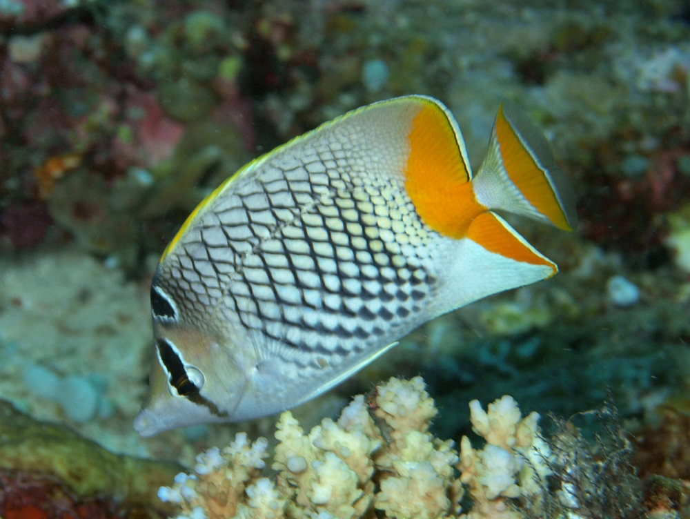 撮影 2009/07/04 沖縄県 西表島 掲載 2014/03/13 ⇒チョウチョウウオの仲間 アミチョウチョウウオと同様に網目模様が特徴ですが、こっちは「お公家様」のマークが額についているので、平安時代であったならだいぶ格上の扱いをされたはずです。