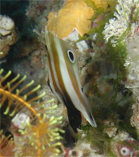 紛らわしい名前ですがチョウチョウウオの仲間。今アップするために魚図鑑を見直して幼魚であることに気がつきました。成魚は擬似眼が消えています。