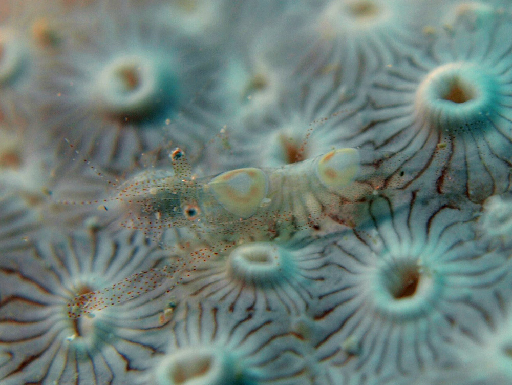 追記 2013/11/12 従来はヒメイソギンチャクエビとしてきましたが、『サンゴ礁のエビ ハンドブック』 峯水亮 (2013年初版 文一総合出版)で『海の甲殻類』からの変更が行われており、この写真の種類はHamopontonia fungicola としています。