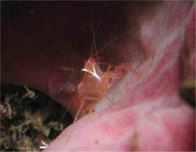 撮影 2003/03/12 フィリピン リロアン ⇒エビの仲間 同色のコーラルの中に隠れていて、肉眼ではどこにいるのか良く分からず、あてずっぽうに何枚か写したら、かろうじて1枚に写っていました。ピントはあっていないけれど、メクラ撮りなんだからまあヨシ。