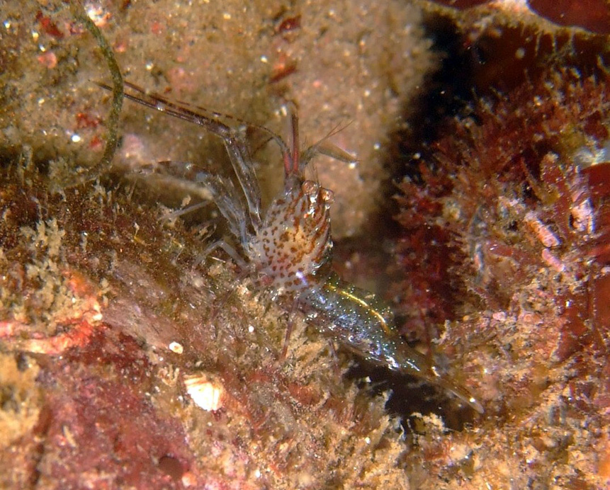 「海の甲殻類 」(文一総合出版)の解説では、『生息環境に合わせて変異が多く、一見同じ種には見えないが、頭胸甲を斜走する不鮮明な破線模様は比較的安定し、多くの個体に見られる。また、大きさや数は個体により差があるが、体全体に明青色の斑点が散在する』とあり、今回の写真は典型的なパターンのようです。