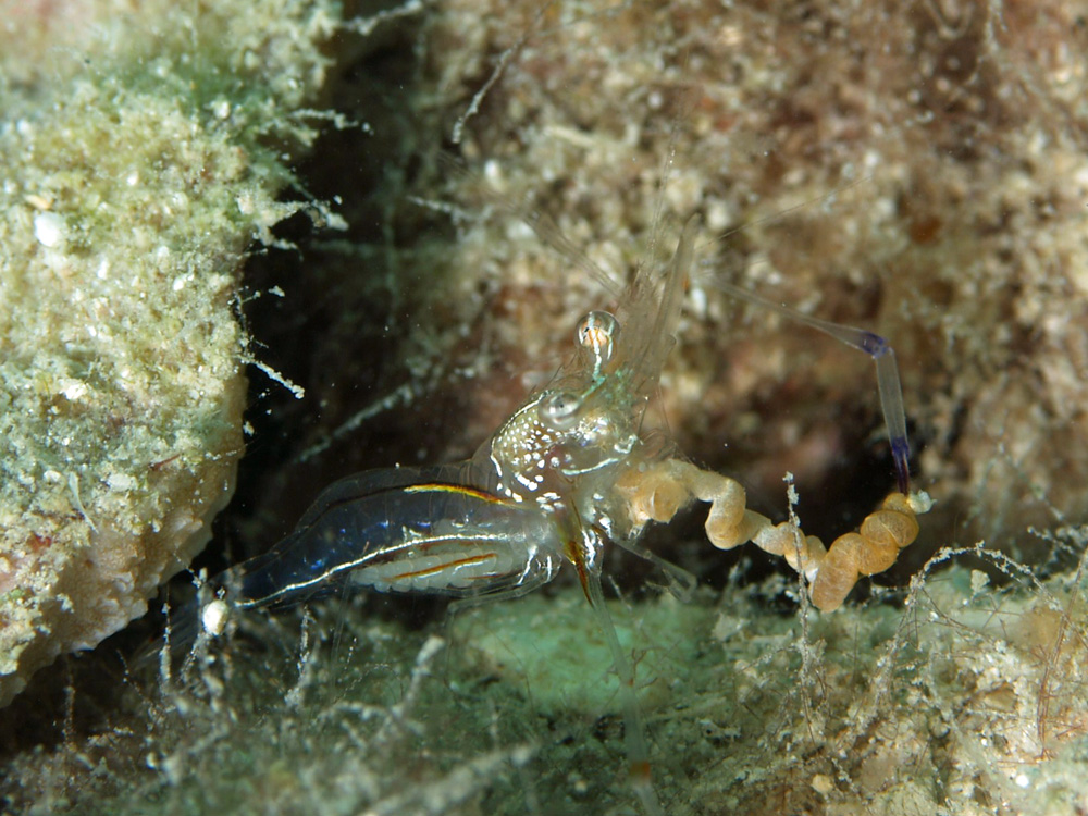 追記 2014/01/26 これまでシオダマリカクレエビと決め打ちしてきましたが、『海の甲殻類』 峯水亮/武田正倫/奥野淳児 (2002年初版2刷 文一総合出版)の解説を改めて読み直すと、「大きいはさみ脚の各関節部に暗褐色の斑点があり、指部は中央と先端に暗褐色の黄帯がある。」となっています。