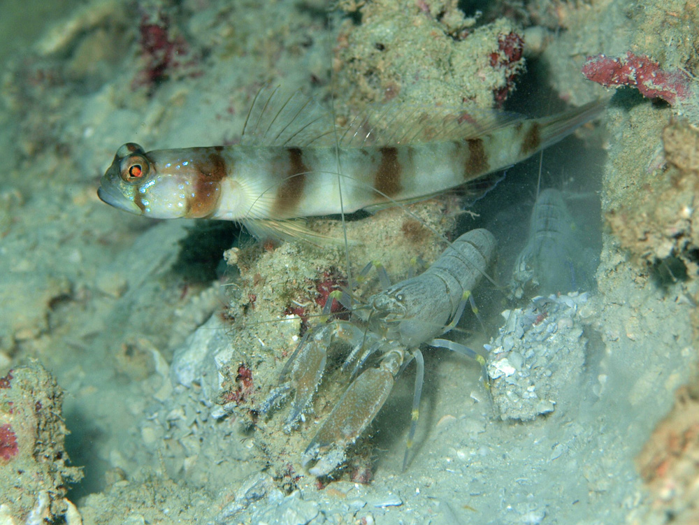 エビが2連で砂を外に運んでいます。働き者ですね。しかも用心深さもちゃんと持ち合わせていて、どちらも触角の1本をハゼに接触させて危険信号を受け取るようにしています。防災対策万全なり。