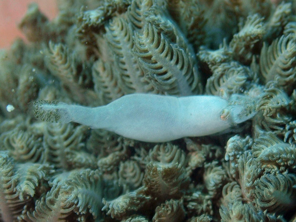 全身が白で、色々な模様の多いエビの中ではかえって個性的と言えるかもしれません。どういう訳か尾だけに宿主と同色の模様が入っています。