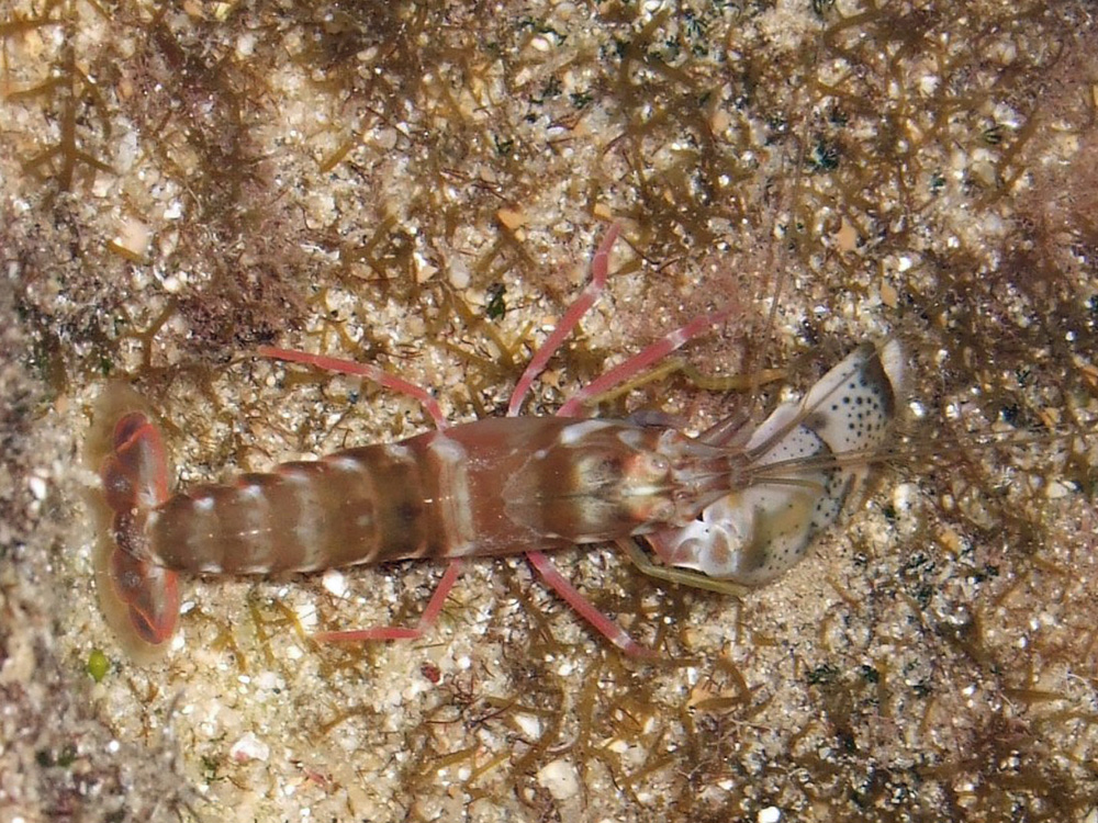 掲載 2008/06/06 沖縄県 石垣島 撮影 2012/11/23 ⇒エビの仲間 ビーチを散歩していて出逢いました。第1胸脚の一部が白くて黒っぽい斑点があるところはゲツメンテッポウエビに似ていますが、その他のところは大なり小なり異なるのでそれとは別種と判断しました。