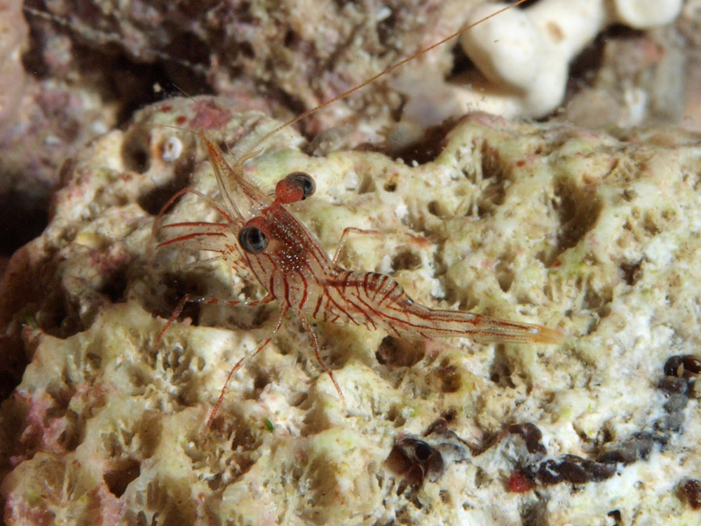 ヤイトサラサエビの子どもかなあと想像するのですが、手持ちの図鑑にもWebにも子どもの写真が見つからないので確定できません。やむなく不明種に。