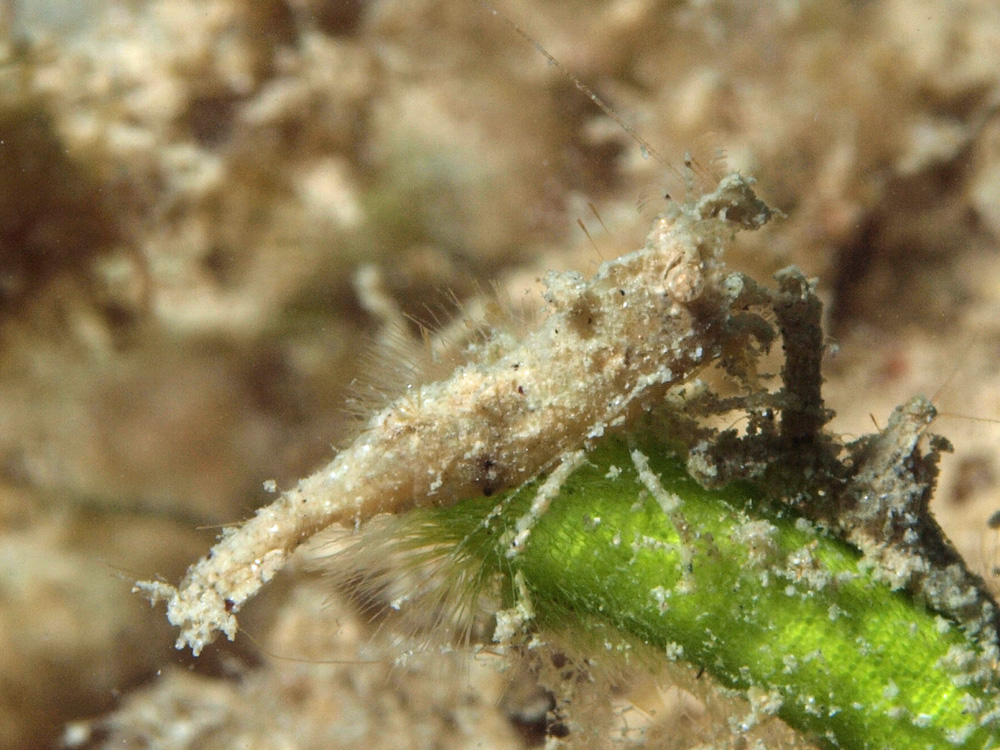 体中にいろんなものをくっつけて目くらましをしているので写真からは真の姿がわかりませんが、ガイドがボードにヒラツノモエビ属 SP.と書いたのでそれに従いました。