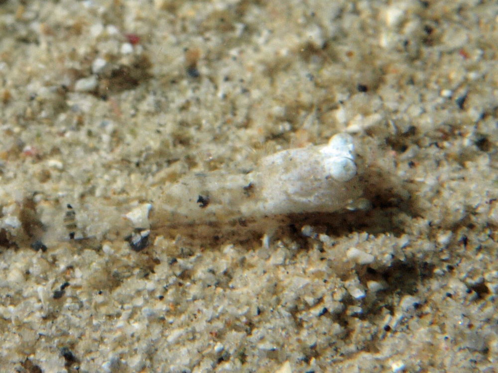 撮影 2013/11/12 沖縄県 沖縄島 掲載 2019/06/28 ⇒エビの仲間 かなり小さい上に体色が砂地と同化していて、老眼ではどこが砂でどこが模様なのかよくわからない個体でした。それでも、エビであることは間違いないと思います。(貝殻と海藻がくっついてエビのように見えているなんてことは、まさか・・・ないよね。)