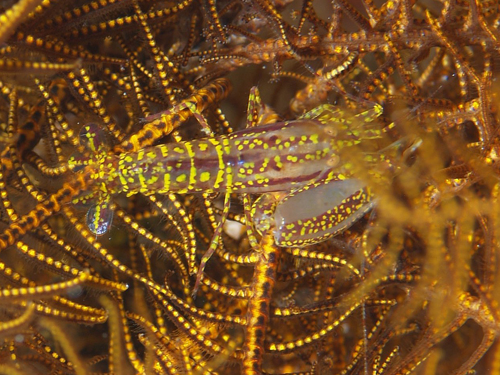 追記 2013/05/03 これまでハクセンコマチテッポウエビとしてきましたが、『サンゴ礁のエビ ハンドブック』 峯水亮 (2013年初版 文一総合出版)によると誤った混同であって、正しくは学名のない別種だそうです。