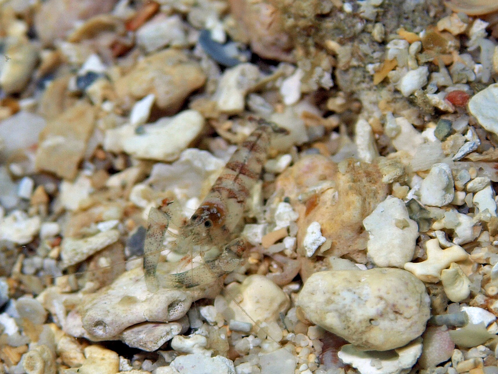 ハサミ脚の形状からテッポウエビ属の一種だと思いますが、自分ができる範囲の調査では種類は分かりませんでした。ときどきこんな目つきの犬がいますが、遠慮がちというか控え目な性格に見えたのが印象に残っています。