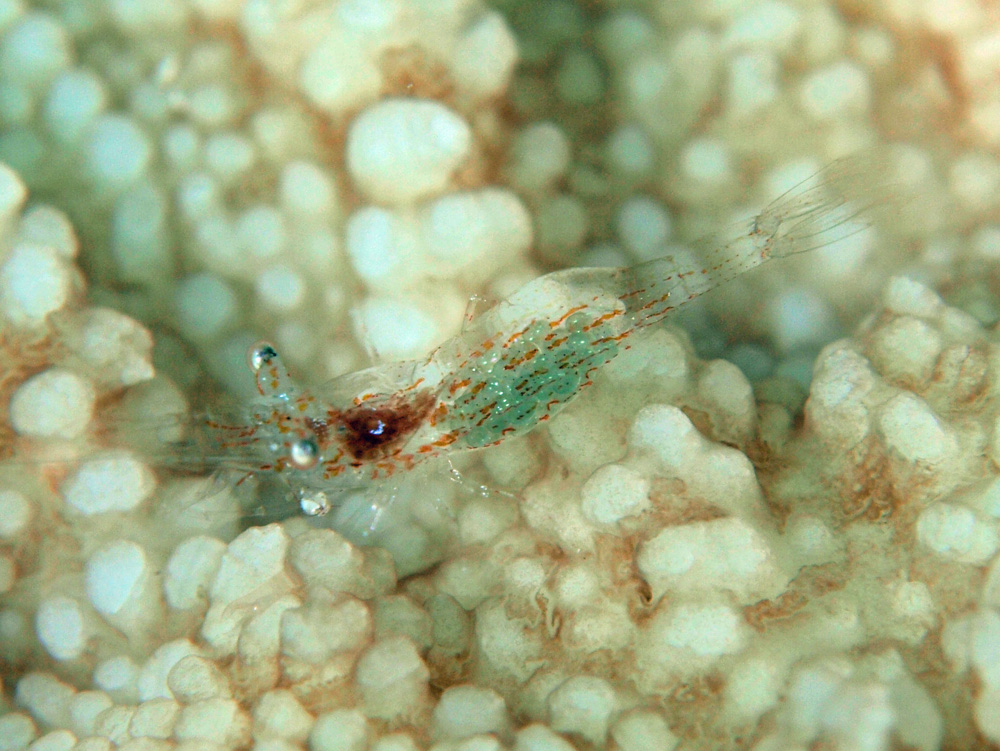 体長は1p前後と小さなエビさん。体は透明で向こう側が透けて見えています。 眼柄と体の縦方向に赤褐色の破線が並んでいるのと、分かりにくいけれど白点が散在しているのが特徴です。