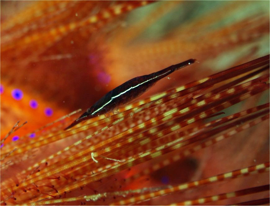 普通のガンガゼについていると体色が保護色になって見つけるのがすごく難しいのですが、アカオニガゼについていたので割合簡単に見つけることができました。