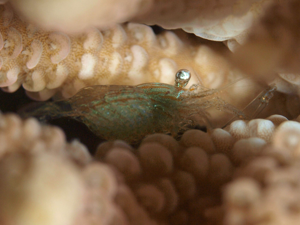 サンゴの枝の隙間の奥の方で、いつも頭を下に向けているエビさん。なので、後ろ向きにしか撮れないのが普通なのに、斜め後ろからではあるにしてもほぼ横向きに撮れています。