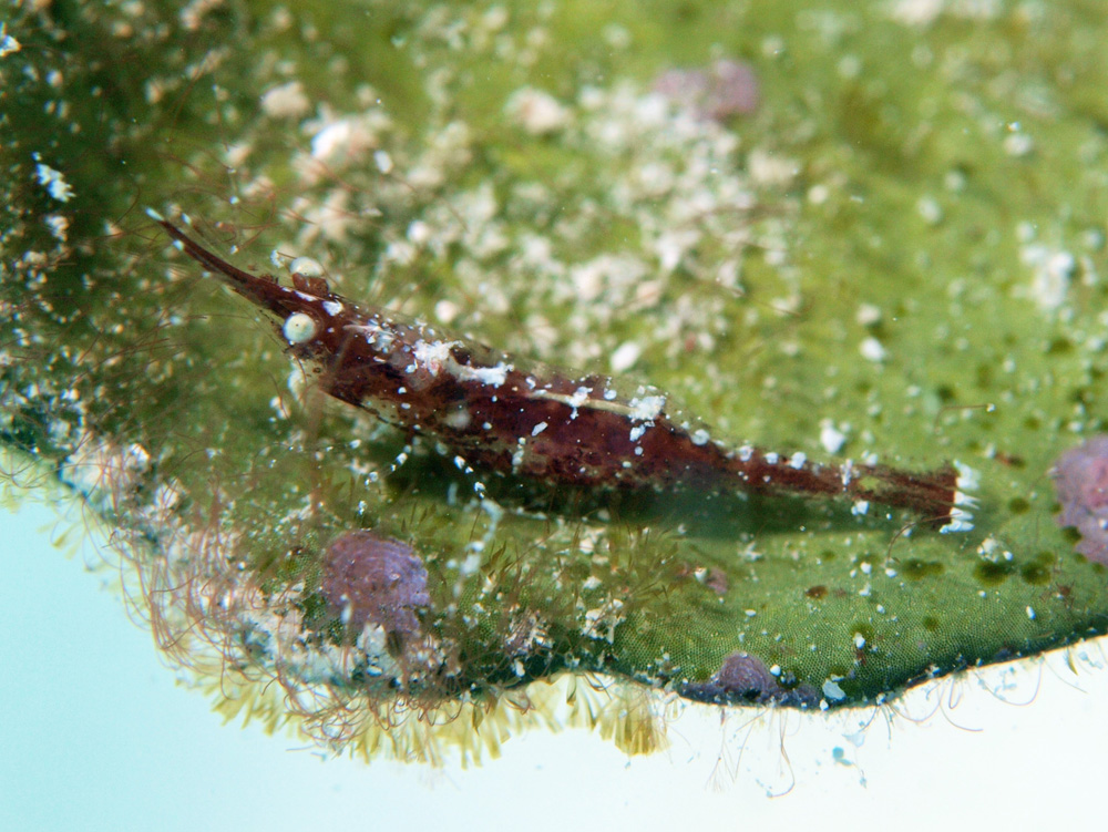 藻場の草にいることが多く、体色は宿主に合わせて緑系が多いようですが、この個体は茶色なので追加しました。