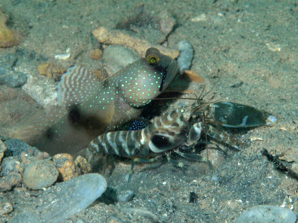 撮影 2008/10/13 沖縄県 西表島 掲載 2013/04/29 ⇒エビの仲間 既掲載分は上からのアングルでしたが、横からのアングルが撮れたので追加しました。 また共生しているギンガハゼはホリモンツキテッポウエビとカラーコーディネイトして灰色です。