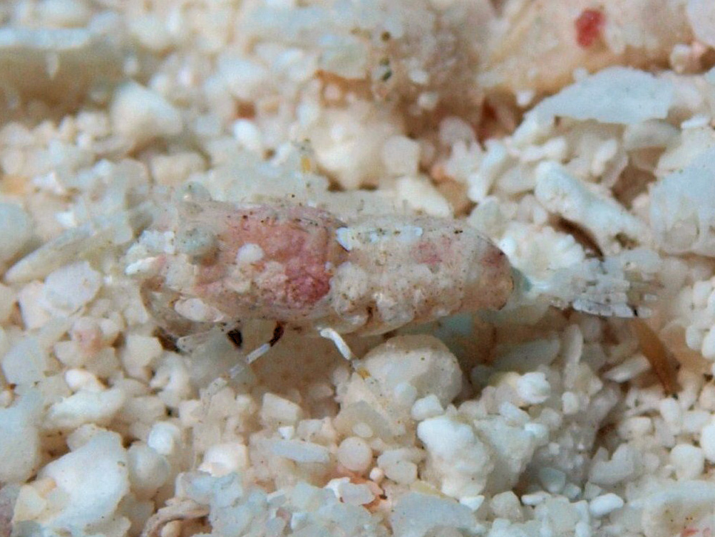 小型のエビで、体形や生息環境(この時はサンゴ礁池)から、おそらくエビジャコの仲間です。