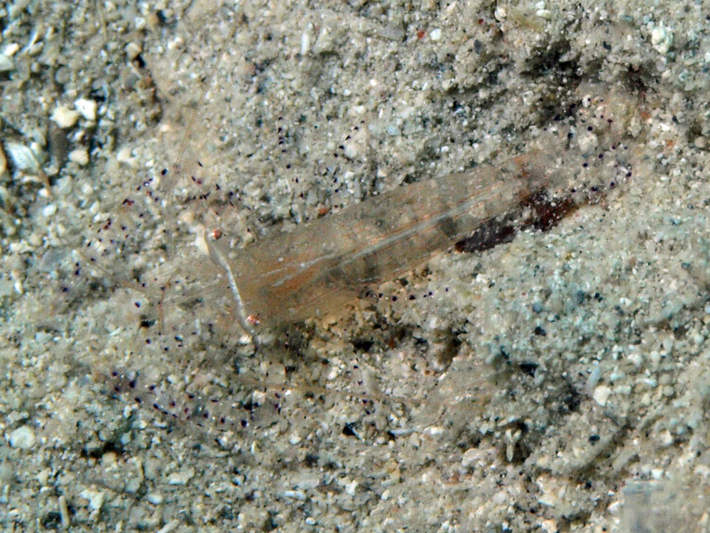 体の透明度が高くて向こう側が透けて見えています。また、ガレ場なので見分けにくいのですが胸脚と尾鰭には暗褐色と白色の斑点があります。