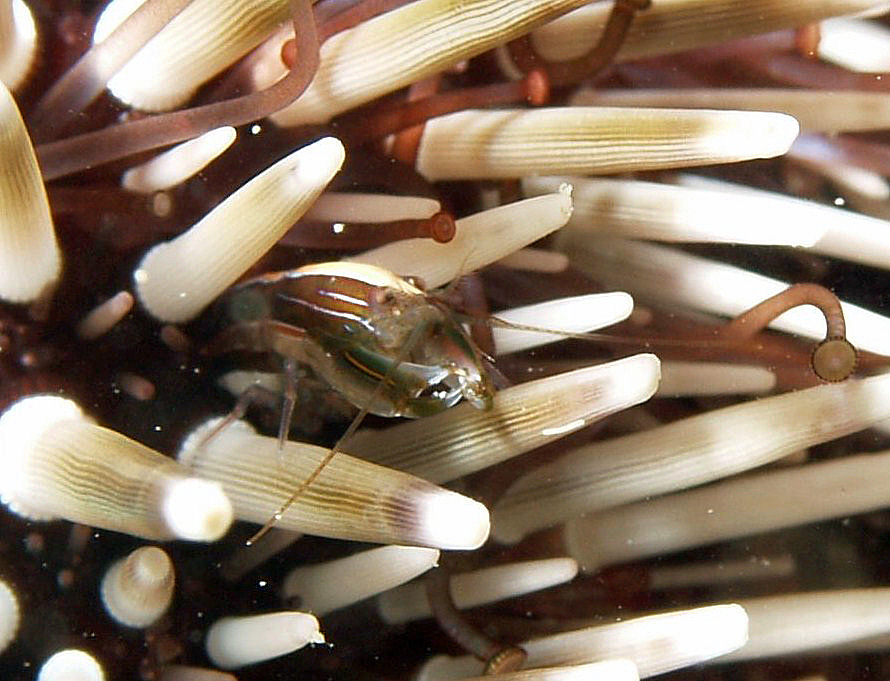 小型でウニの棘の隙間に潜んでいるため、見つけるのが難しい上に、棘が絶えず動いているのでピントを合わせるのが難しいという2重の困難が伴う厄介なエビですが、それだけに撮れただけでも嬉しさが込みあげてきます。