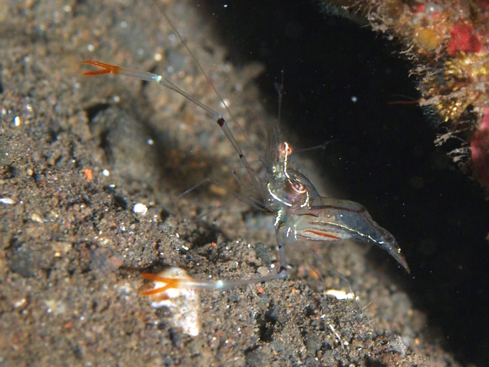 追記 2020/12/28 『サンゴ礁のエビ ハンドブック』 峯水亮 (初版 2013年 文一総合出版) P.45 の解説ではこのエビは2タイプあって、こちらはサミの先端がオレンジ色のタイプです。以前の写真は肝心のハサミの先端が見えなかったので、それを確認できる写真に差替えました。
