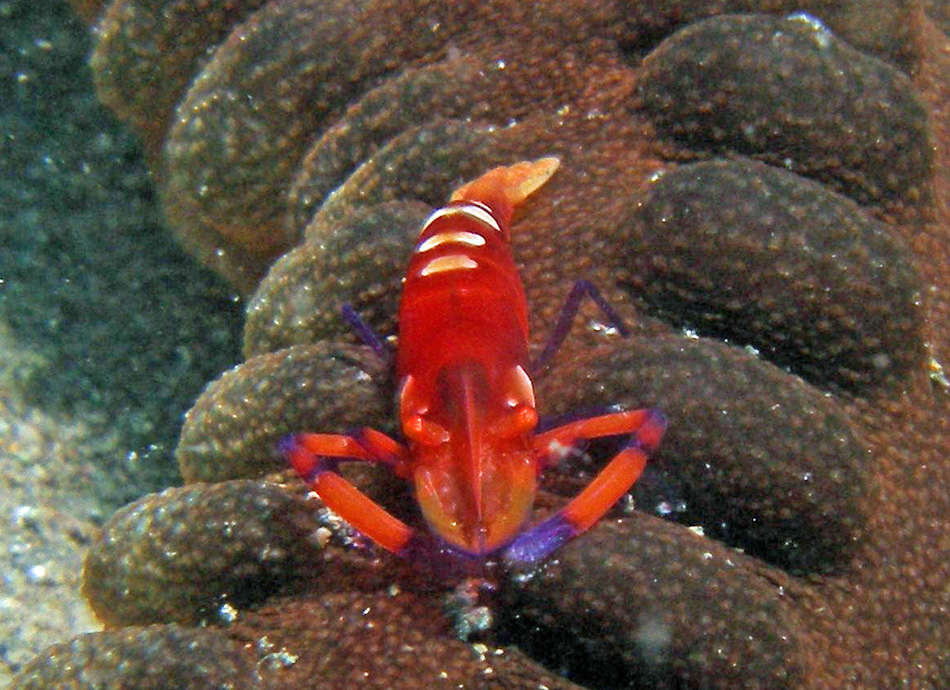 保護色になっているどころか、目立つこと目立つこと。甲殻類を好物にする敵だらけの中で、身を守る術もない小さくて弱い立場のエビが、いったい誰に何をアピールするというのでしょうか。もっと地味に隠れていればいいのにナー。