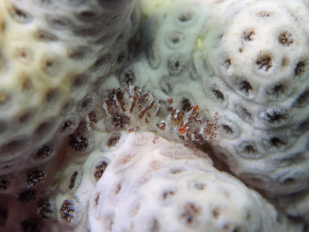 『サンゴ礁のエビ ハンドブック』 峯水亮 (2013年初版 文一総合出版)によると地色は白だそうですが、とてもそうは思えないほどに生活環境の色柄に同化しています。