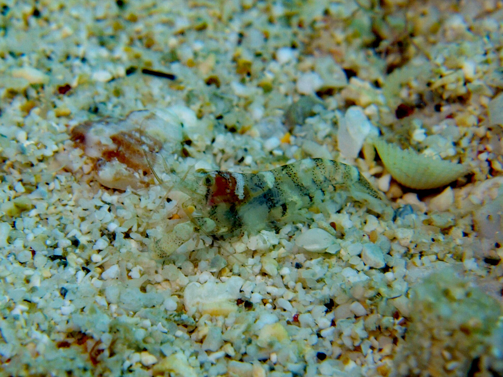 周囲の小石たちに紛れていて見つけるのはかなり難しい種類だと思いますが、たまたま他の被写体の写真を撮っていたら目の前に静かにたたずんでいました。ラッキーでした。このエビにとっては、環境にまぎれ、ジーッとして動かないことが敵に見つからない最善策なのでしょう。
