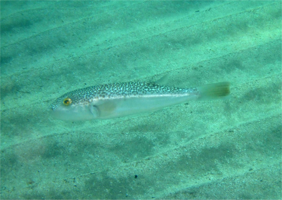 なんだ、普通に見かけるクサフグかと思ったら、クサフグは腹部に大きな黒斑があるので違う。最後に行き当たったのがコモンフグで、褐色で不規則な淡色斑が散在していて腹部が白いのでドンピシャ。以上で一丁上がり。