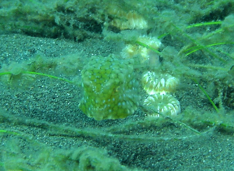 フグが体色を変えるってあるのかなーと否定的に思いますが、もしかしたら周辺の緑の海草に合わせているんでしょうか?ムムムム・・・分からん。