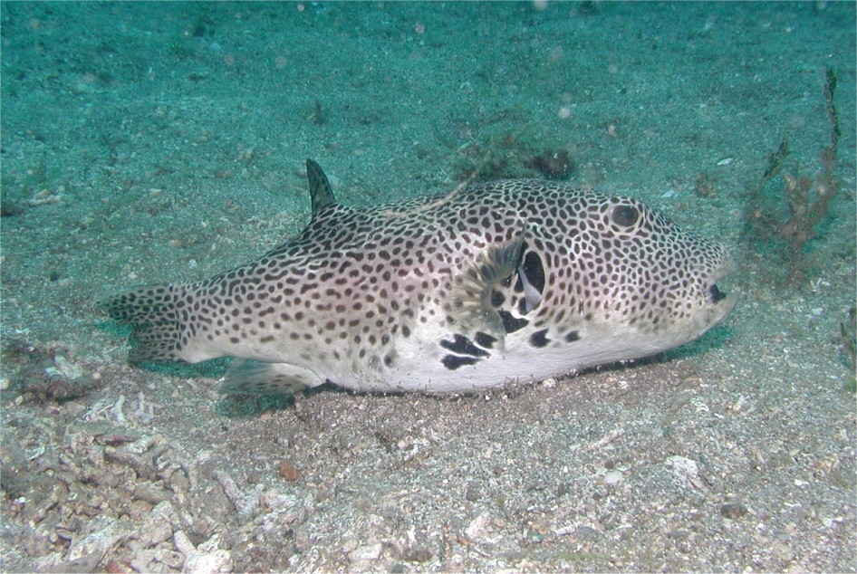 「日本の海水魚」で見るとモヨウフグが該当するのですが、黒点斑の大きさにずいぶん違いがあって、図鑑の方がずっと斑紋が細かいので、近似種で別物なのかもしれないと、「Indonesian