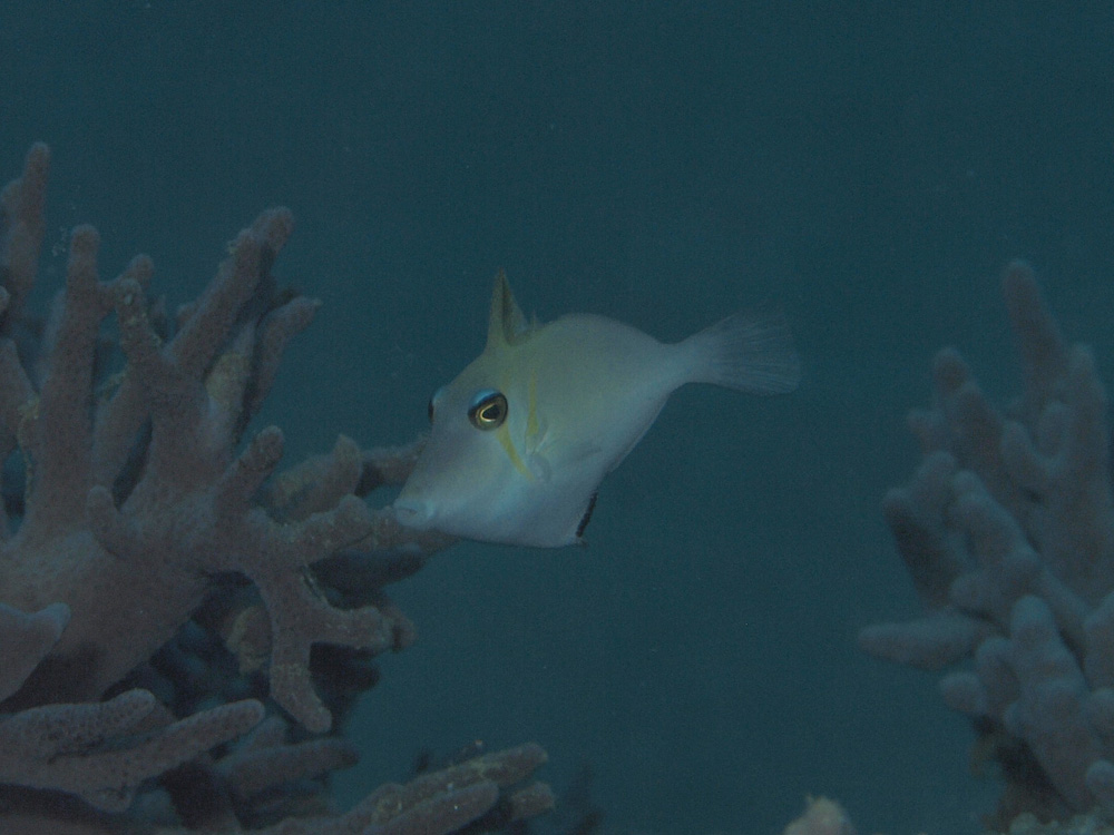 撮影 2013/09/10 沖縄県 沖縄島 掲載 2018/02/26 ⇒フグの仲間 幼魚です。残念ながら接近して撮ることができませんでした。 せっかく背びれをピンと立てて良い姿勢なのになあ。できることならお互いの距離が0になるまで近づいて頬ずりしたかった・・・