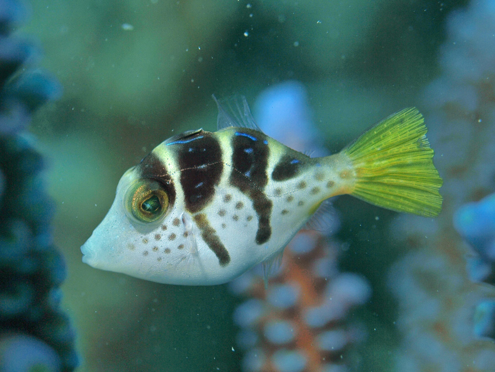 撮影 2008/10/13 沖縄県 石垣島 掲載 2013/04/30 ⇒フグの仲間 こちらは幼魚。 成魚が口が大きく突き出ているのに比べると、まだ突き出る程度が少なくてオチョボ口です。 その一方でキンキンギラギラの眼は幼魚にしてはキツイなあ。