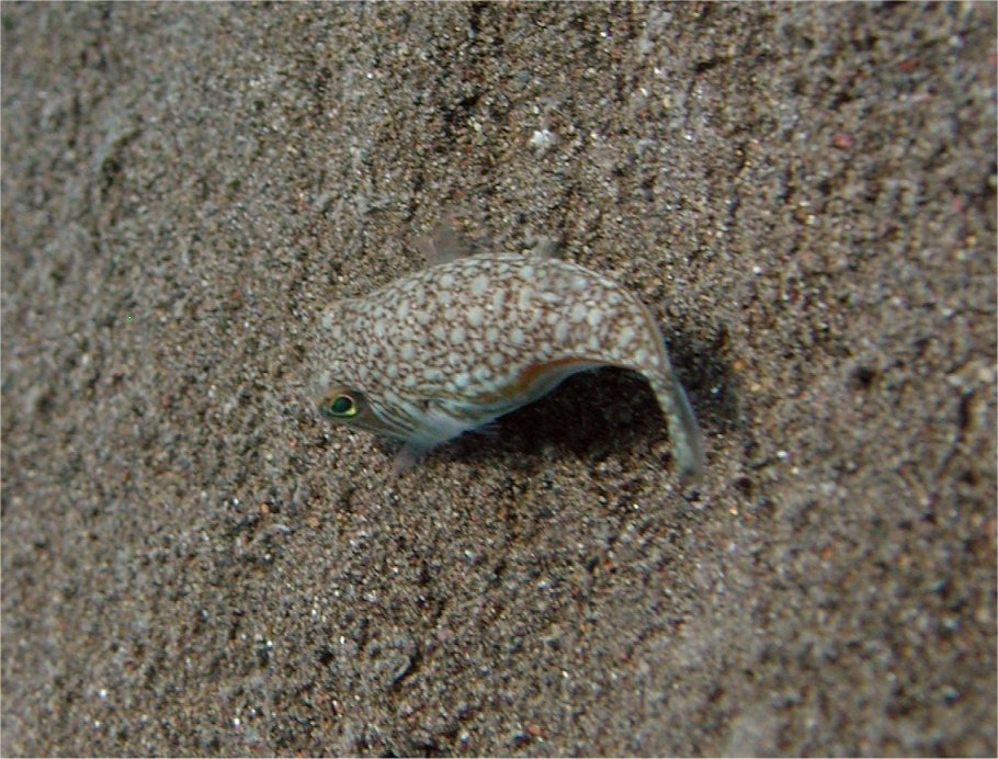 これと似た種類にナミダフグがありますが、体側の黄褐色縦帯が不連続かどうかで識別し、この被写体はシッポウフグに同定しました。