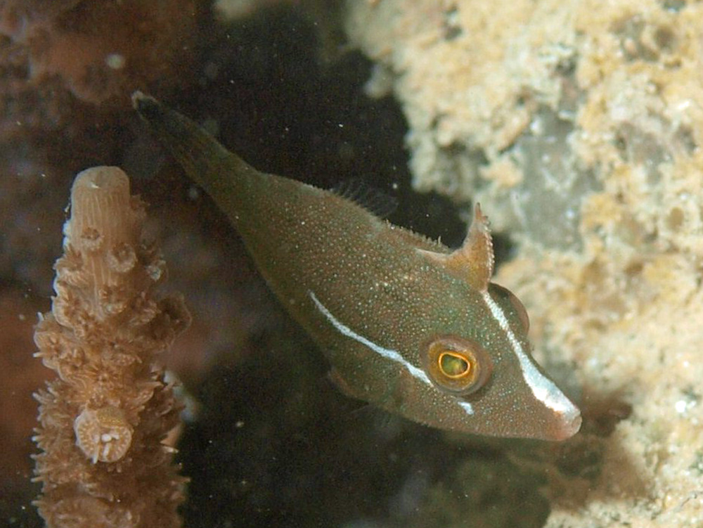 全長およそ2cmのおチビちゃんです。この段階では白色の網目模様は消えて、胸鰭のあたりに1本の縦縞が入るだけです。