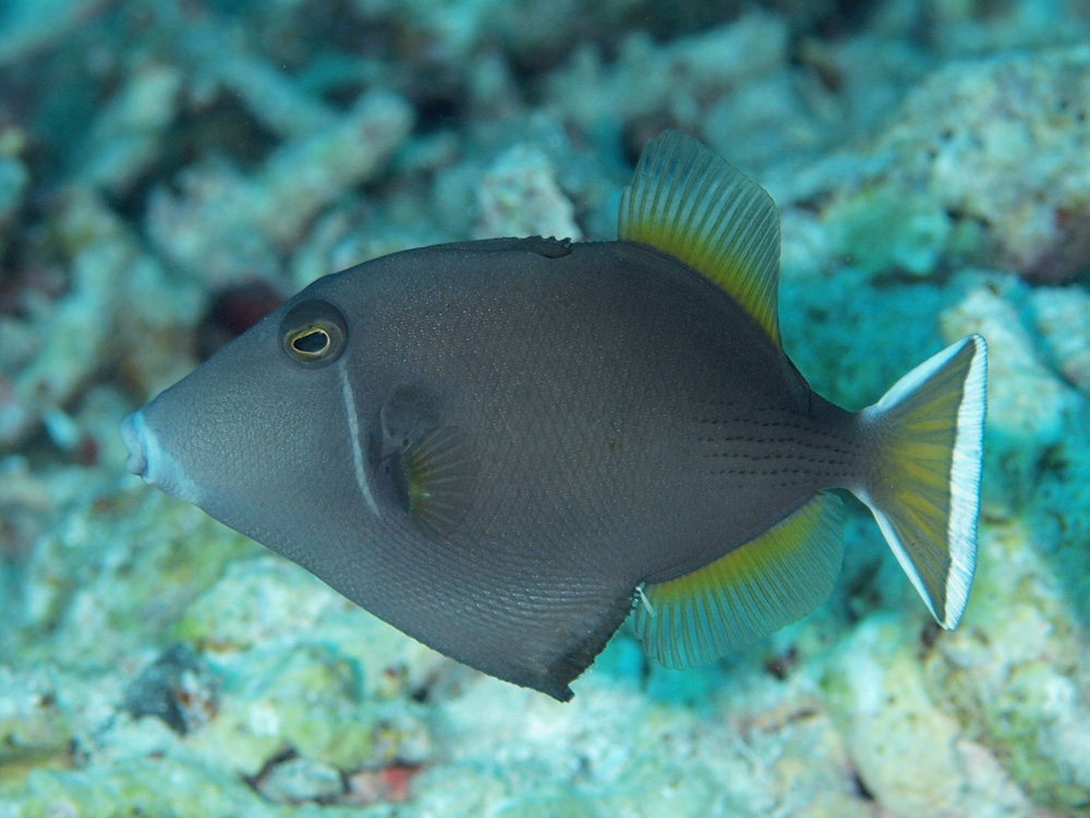撮影 2008/12/02 沖縄県 石垣島 掲載 2013/05/28 ⇒フグの仲間 前掲の個体は体色が体の後半部は薄茶色ですが、こちらの個体は全身灰色なので追加しました。尾ひれが開いているので“ツマジロ”がよく分かります。