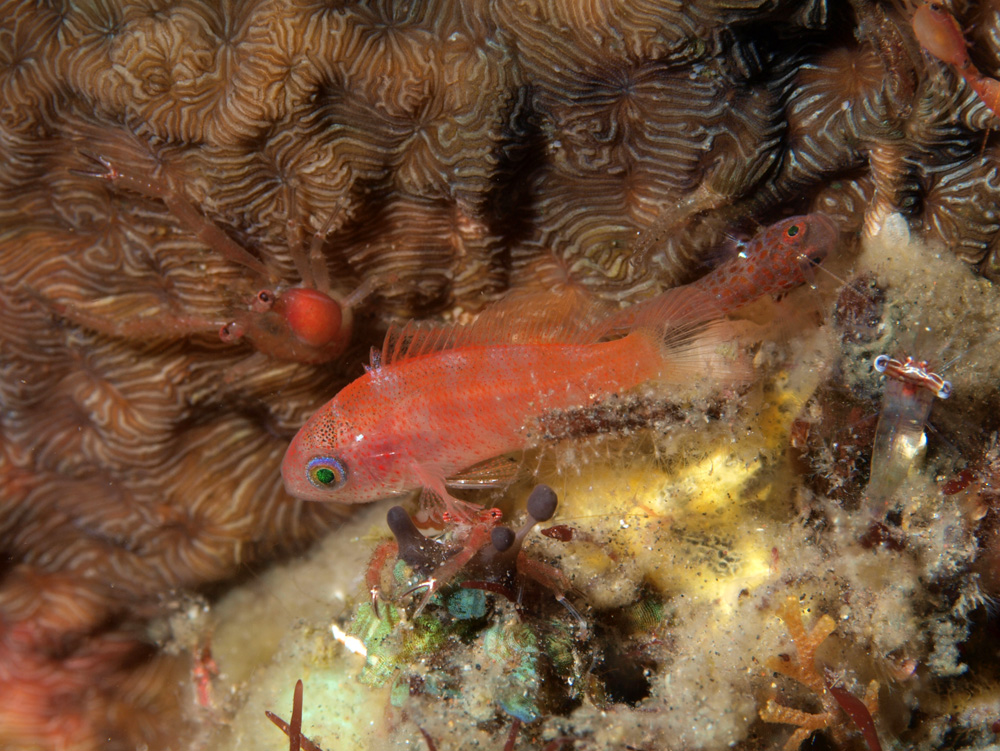 この魚に夢中で全く気付かなかったのですが、後にパソコン上で見たら頭部の上と下にコシオリエビ、尾部に赤点が全身に入っている魚、頭部以外はほぼ透明なエビが写っていました。