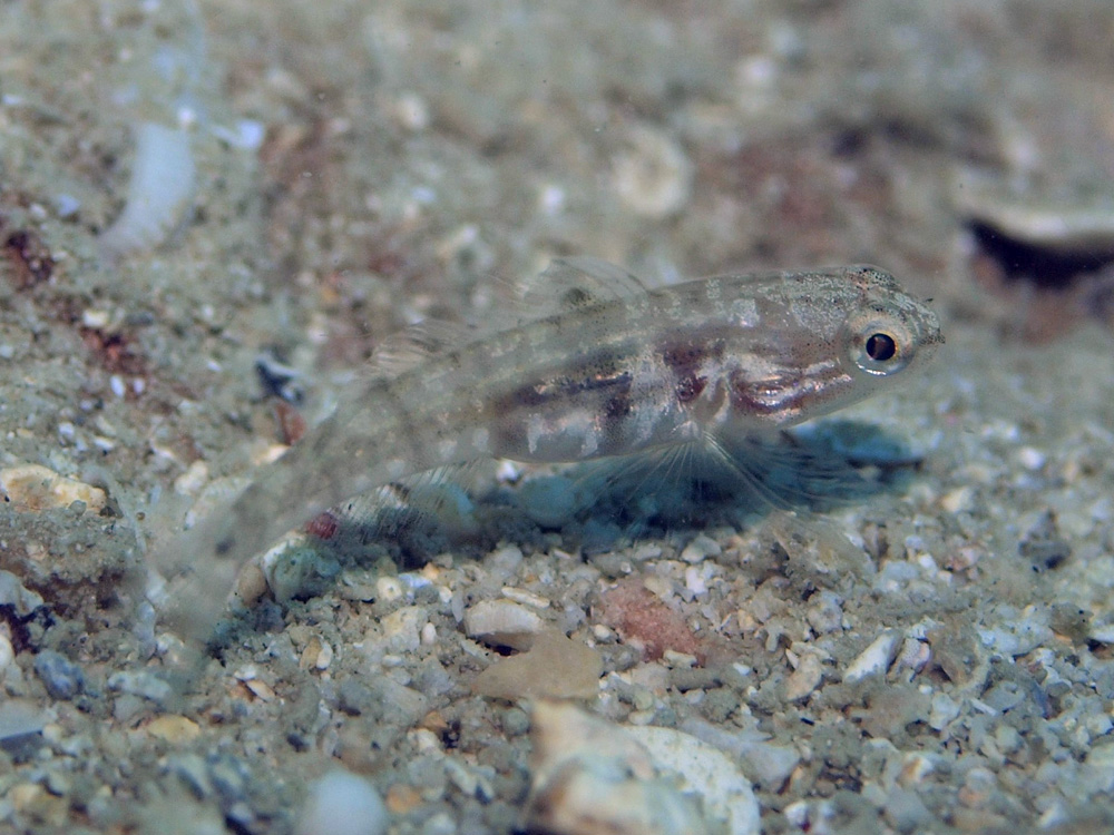 全長2pほどの小さな魚。半透明で骨が透けて見えています。そんなところからすると幼魚でしょう。稚魚という方が的確かもしれません。
