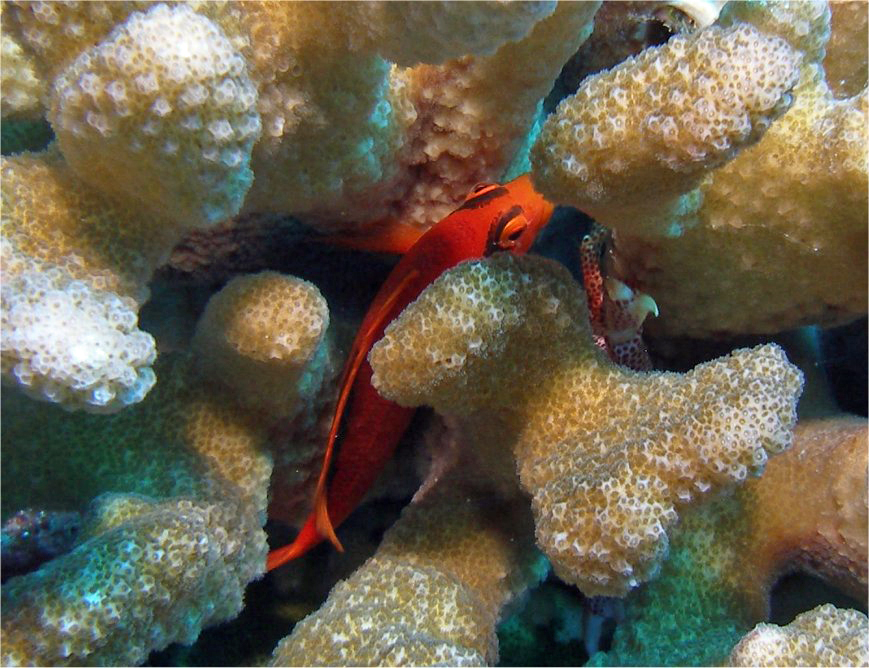イシサンゴの狭い隙間の奥のほうでチョロチョロ動き回るという、写真撮影には最もやりにくい状況で、ガイドが痺れを切らせて「もう行きますよー」と言うまで沢山シャッターを押した中で何とか分かるのはこの1枚だけでした。
