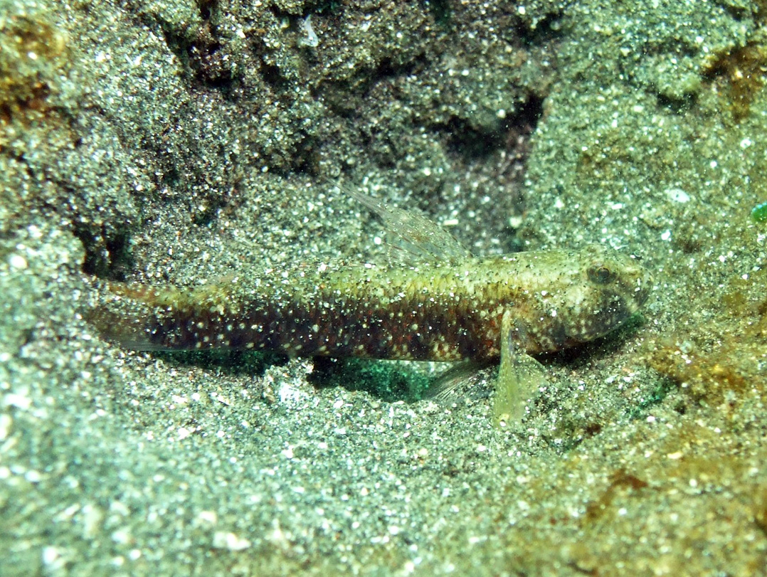 撮影 2006/12/09 インドネシア バリ島 掲載 2011/11/29 ⇒ハゼの仲間 こちらは昼に撮影したもので、しっかり全身が砂の上に出ています。背鰭もしっかり立っていて、なんだかキリッとした印象。 周辺をしっかり見回して、共生ハゼとしての役目をしっかりはたしているようです。