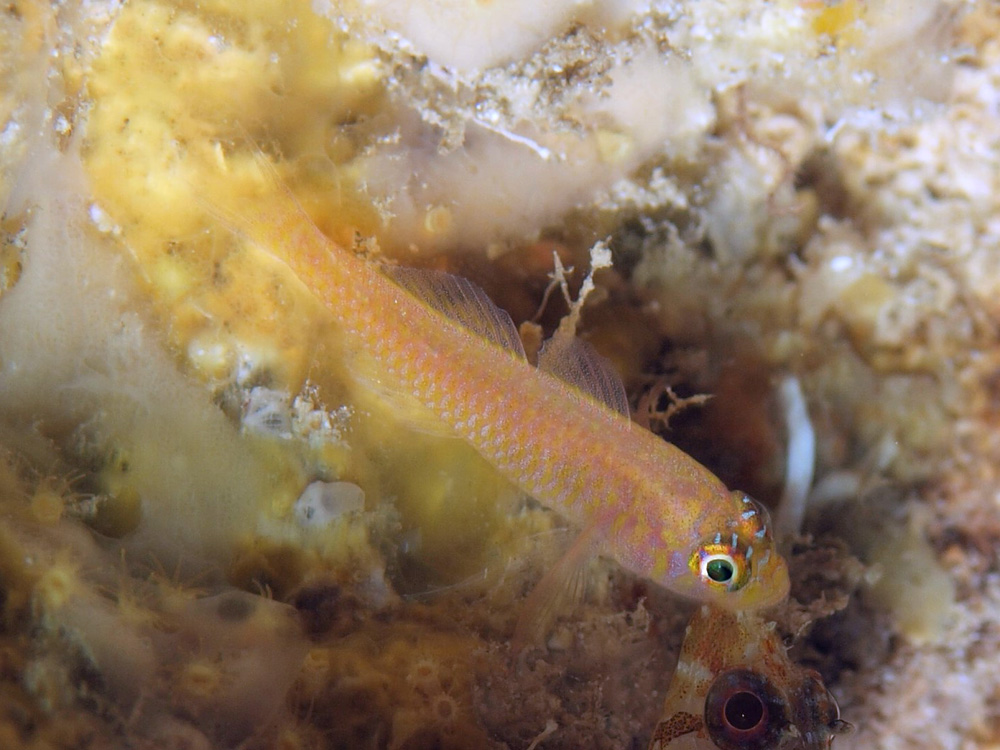 この写真は沖縄撮影なのでその点が問題で、間違いないとは思いますが疑問符付きとしました。(この被写体の頭部のすぐ下にあるのは種不明のヘビギンポの頭部です。ハハハ、掲載直前まで映り込んでいるのに気づきませんでした。)