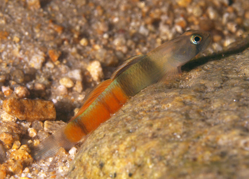 撮影 2008/05/11 沖縄県 石垣島 掲載 2012/10/10 ⇒ハゼの仲間 雄です。川の渓流域で撮影しました。 前回は地味な雌と出逢い、今回は派手な婚姻色の雄との出逢いです。このサイズに縮小するのが残念に思えるくらい大きくて色の出た写真が撮れて嬉しい川遊びでした。