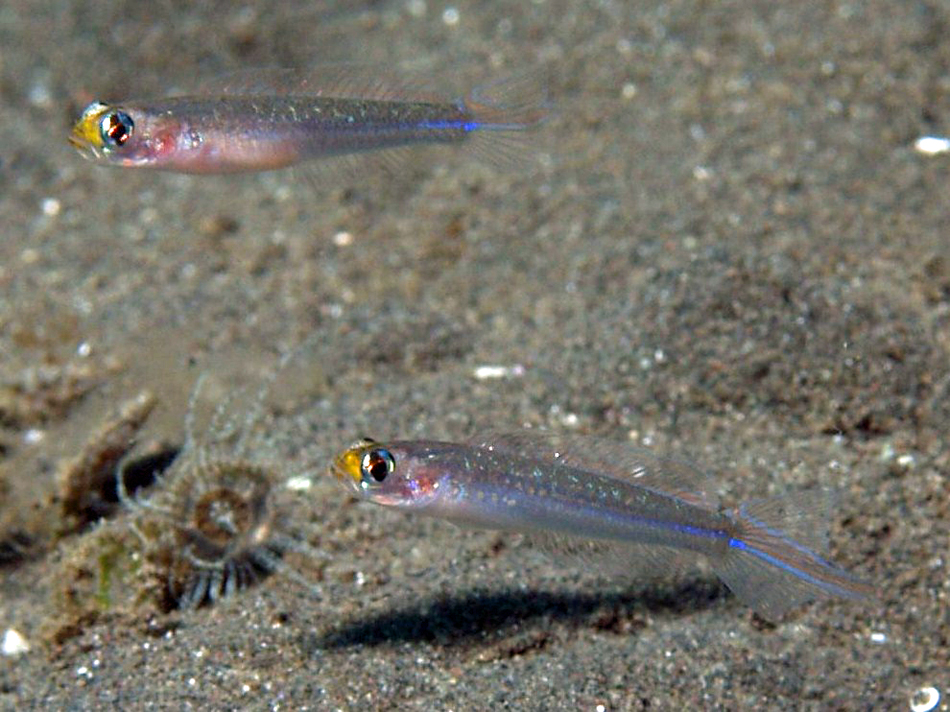 水深20m前後の砂地でずーっと2匹で寄り添いながら泳いでいました。全長5cmあるかないか。薄い体色ですが、なかなか綺麗です。顔のサイズに比べて眼が大きいのも特徴ですかね?詳細が何も分からないのが残念です。