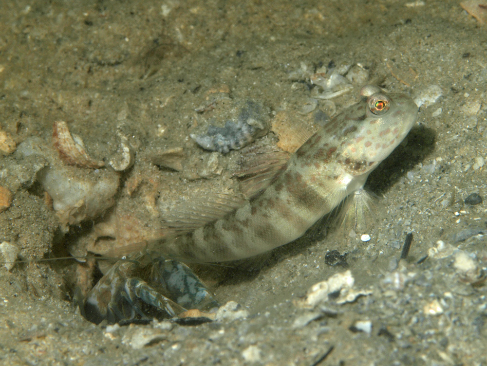 撮影 2011/08/29 沖縄県 石垣島 掲載 2015/06/12 ⇒ハゼの仲間 湾奥のドロっぽい砂地にひっそりと目立たないようにしてエビさんと暮らしていました。エビはおそらくホリモンツキテッポウエビ。